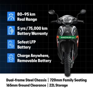 Ampere Powered by Greaves Electric Mobility Magnus Neo Electric Scooter | 80-95 km Real Range, Safest LFP Battery with 5-Year/75,000km Warranty, City-Speed Family Scooter, Strong Dual Frame Chassis (Glossy Black)