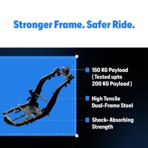 - Design : Sturdy dual-frame steel chassis. Spacious 720mm seat comfortably fits your family or business needs (up to 150 kg), with 165 mm ground clearance for Indian roads.
