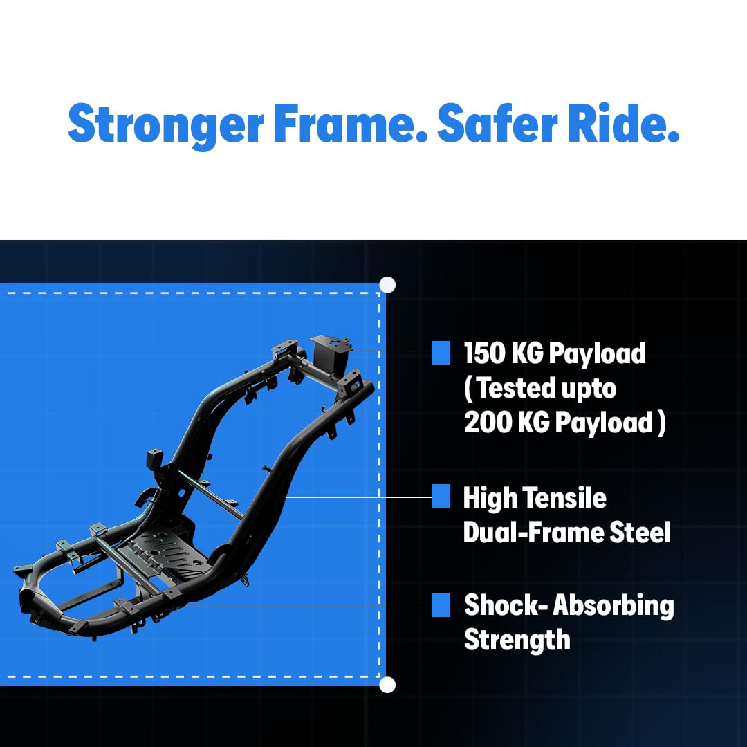 Design : Sturdy dual-frame steel chassis. Spacious 720mm seat comfortably fits your family or business needs (up to 150 kg), with 165 mm ground clearance for Indian roads.